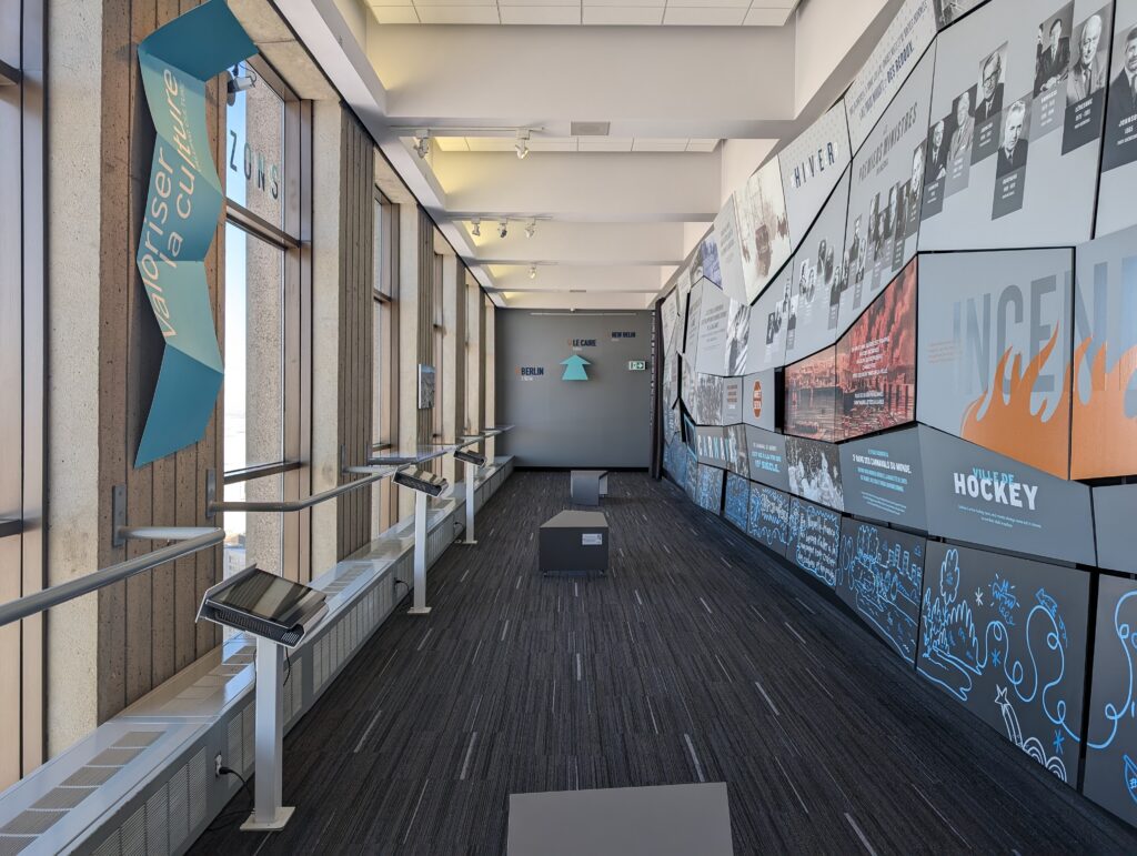 Tout au long des immenses façades, des tablettes interactives vous permettent de situer les lieux emblématiques de la ville ville et d’en apprendre sur leur histoire. Dans le haut des fenêtres, vous trouverez également des indications sur la distance de certaines grandes villes du monde. Saviez-vous que Reykjavik est à 3 525 kilomètres de Québec ?